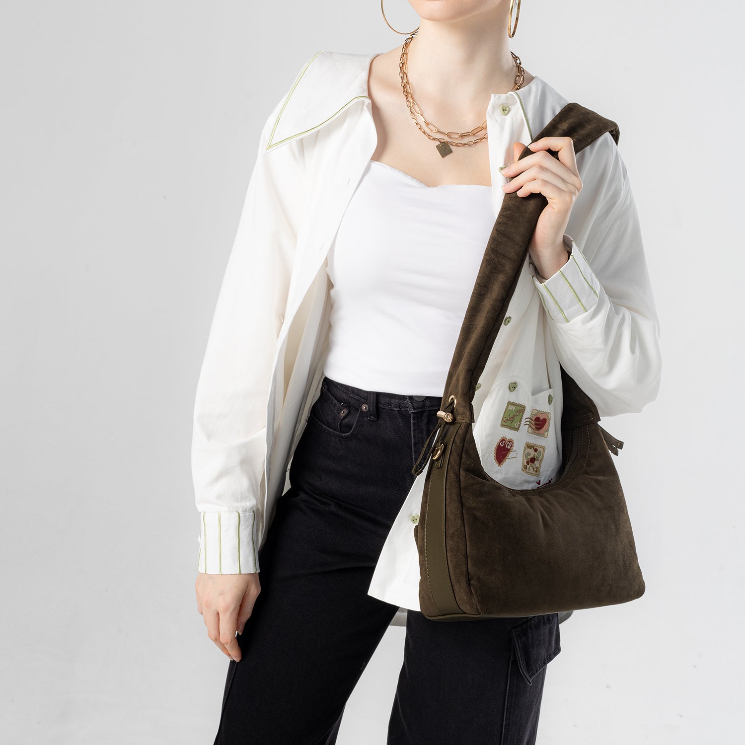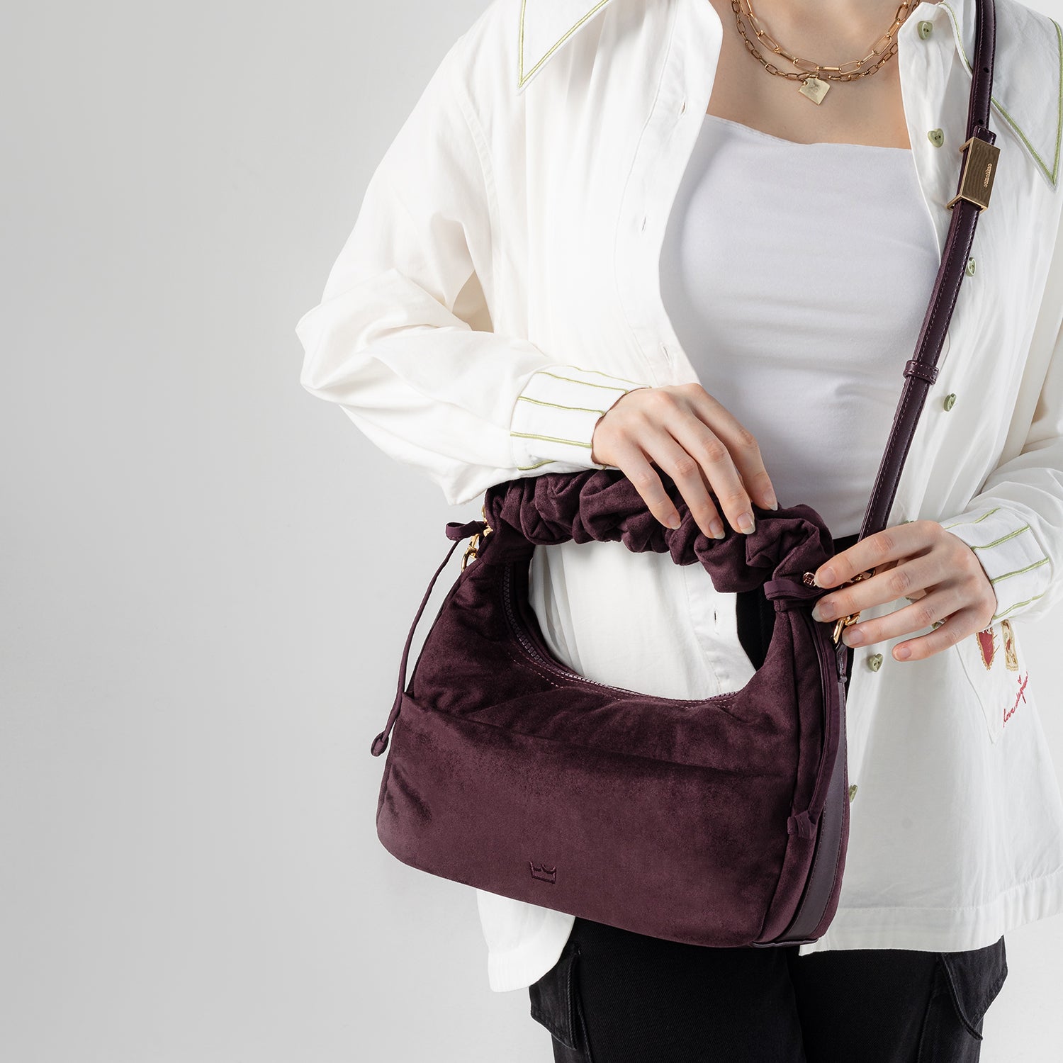 Carry it three ways: grab it by the scrunchie handle, sling it over your shoulder, or wear it crossbody with the long strap. The padded body has a soft, velvety texture, giving the bag a refined and understated look.